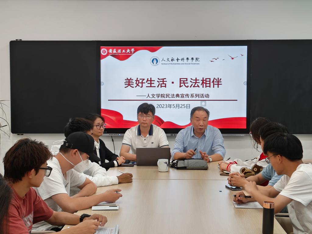 2023年5月是第三个“民法典宣传月”,为认真贯彻落实习近平总书记关于加强民法典学习宣传的重要指示精神,进一步增强师生的法治安全意识,树立良好的法治观念,营造学法、知法、守法、用法的校园氛围。5月25日下午,人文社会科学学院在崇智楼321开展了以“学习民法,‘典’亮生活”为主题的讲座,由人文学院党委书记王大贤主持,副院长代大为授课,师生代表参会。