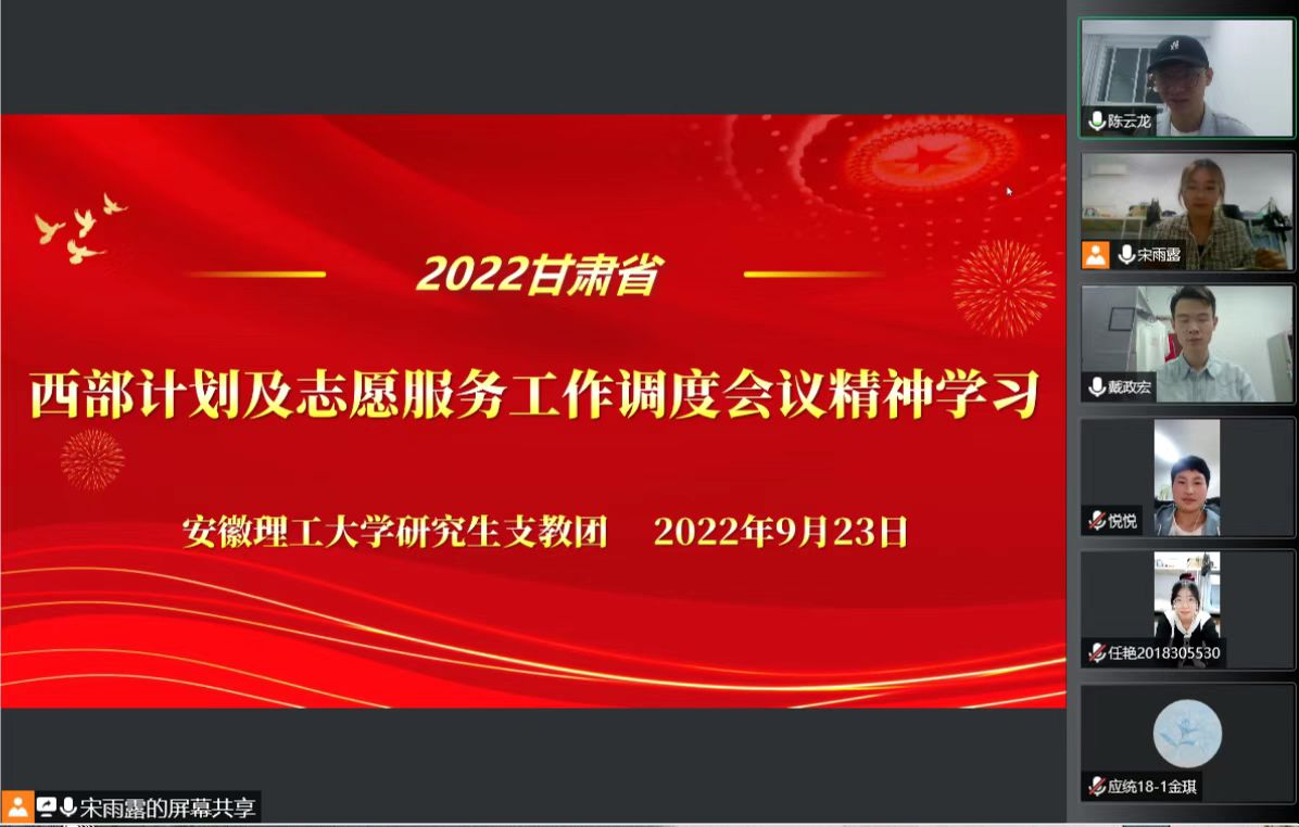 9月23日,甘肃省为推动省西部计划项目高质量发展,进一步完善西部计划管理体制,保证志愿服务各项工作顺利实施,召开了2022年甘肃省西部计划及志愿服务工作调度会。9月23日,安徽理工大学第24届研究生支教团成员进行线上会议,学习会议精神。