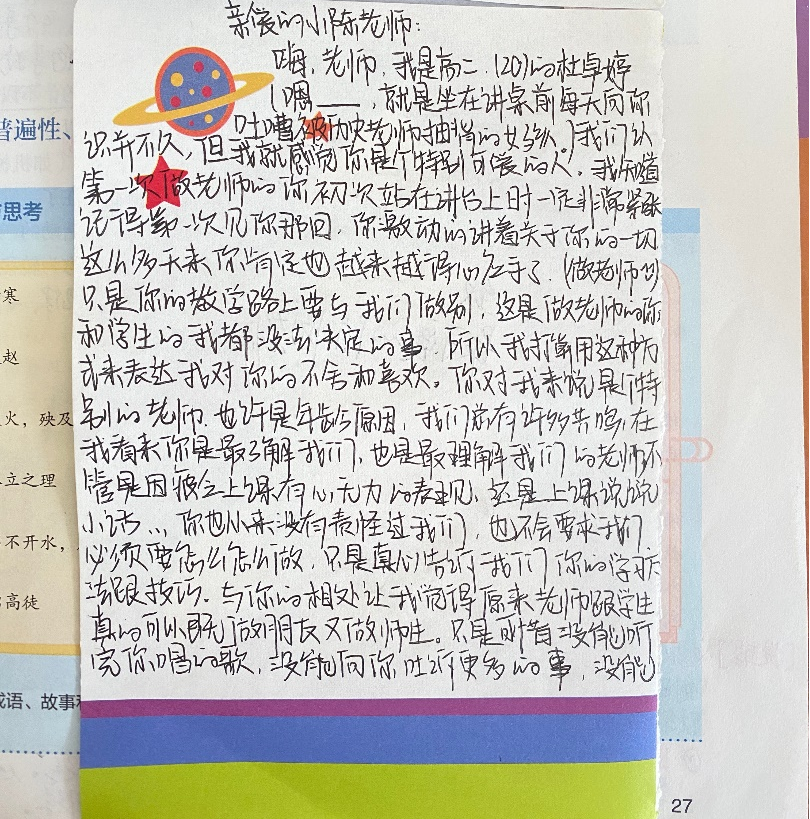 两周很快过去了,之前请假的政治老师也回来了,我不能再带他们了,自己心里空落落的,虽然就带了两个星期,但是这是我刚来到学校认识接触的第一批学生,他们跟我说这边的特色“两水三件套”,也会推荐我去吃食堂三楼的“排骨面”,累的时候诉说她们的辛苦和疲倦……17班的一个女生每次见到我都跟我热情的打招呼,后来发消息说很喜欢我这样的老师,20班一个女孩在我走的时候给我写了一封信,表达对我的喜欢和不舍。看着信里的内容,我感受到了温暖和幸福。两周时间很短,但是师生情谊长存。希望孩子们可以“以梦为马,不负韶华”。勇攀属于自己的高峰!