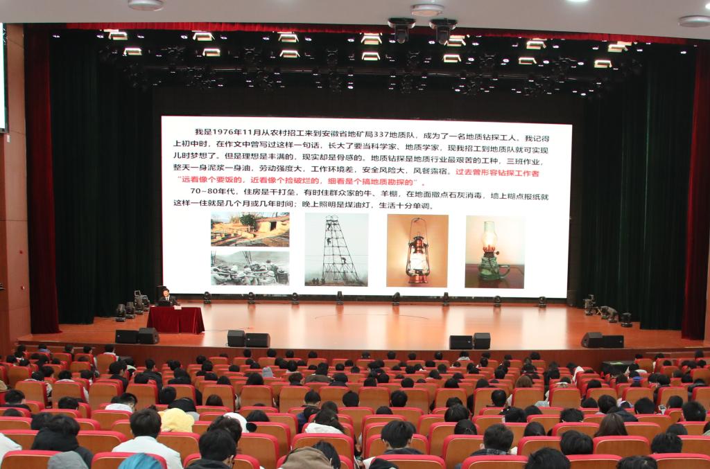 朱恒银从传承红色基因,扣好人生的第一粒扣子、坚守平凡岗位实现人生价值、不忘党恩,创新筑梦、老骥伏枥,初心不变等方面,分享了自己生活、学习和扎根地质钻探一线46年的工作经历、取得的成绩和拼搏奋斗的感悟,用朴实的语言、详实的案例阐释了爱岗敬业、精益求精、追求创新、团结协作、淡泊名利的新时代工匠精神。他殷切寄语学生,要始终保持持之以恒,不躺平、不自卑,不畏艰难,敢于奉献担当,胸怀志远,勇于创新,追求卓越的品质,要用实际行动践行学校“三有三进三到”办学理念,弘扬劳模、劳动、工匠“三种精神”,用创新书写自己精彩的人生。