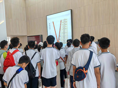 研学中,同学们还来到了学校挑战杯展览馆、图书馆、美育馆、体育馆等场所,仔细参观了解各场馆功能。在挑战杯展览馆,同学们对各类型的科技创新作品表示了浓厚兴趣,并对我校学子的创新能力和创新思维啧啧称赞。