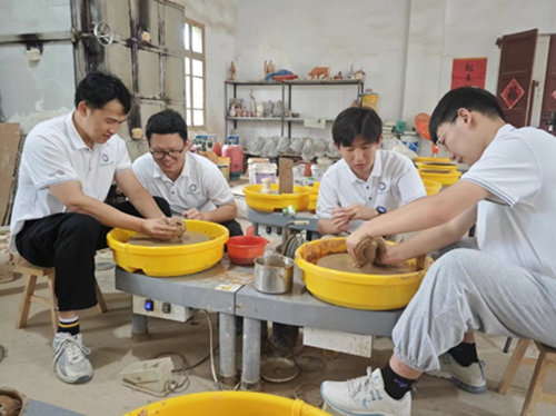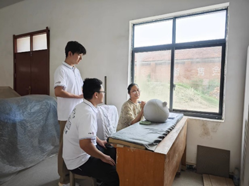 下午,实践团队前往界首彩陶公园,采访了当地著名的彩陶非遗传承人卢莉华兄妹。卢莉华表示,创新的基础在于持续的学习与实践,他从小跟随父亲学习这一技艺,同时也感谢国家的政策支持,使彩陶文化得以更好地保护和传承。最后,在工作人员的指导下,团队成员还亲自体验了彩陶拉胚和雕刻过程,感受到了这一传统工艺的独特魅力。