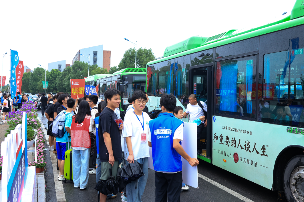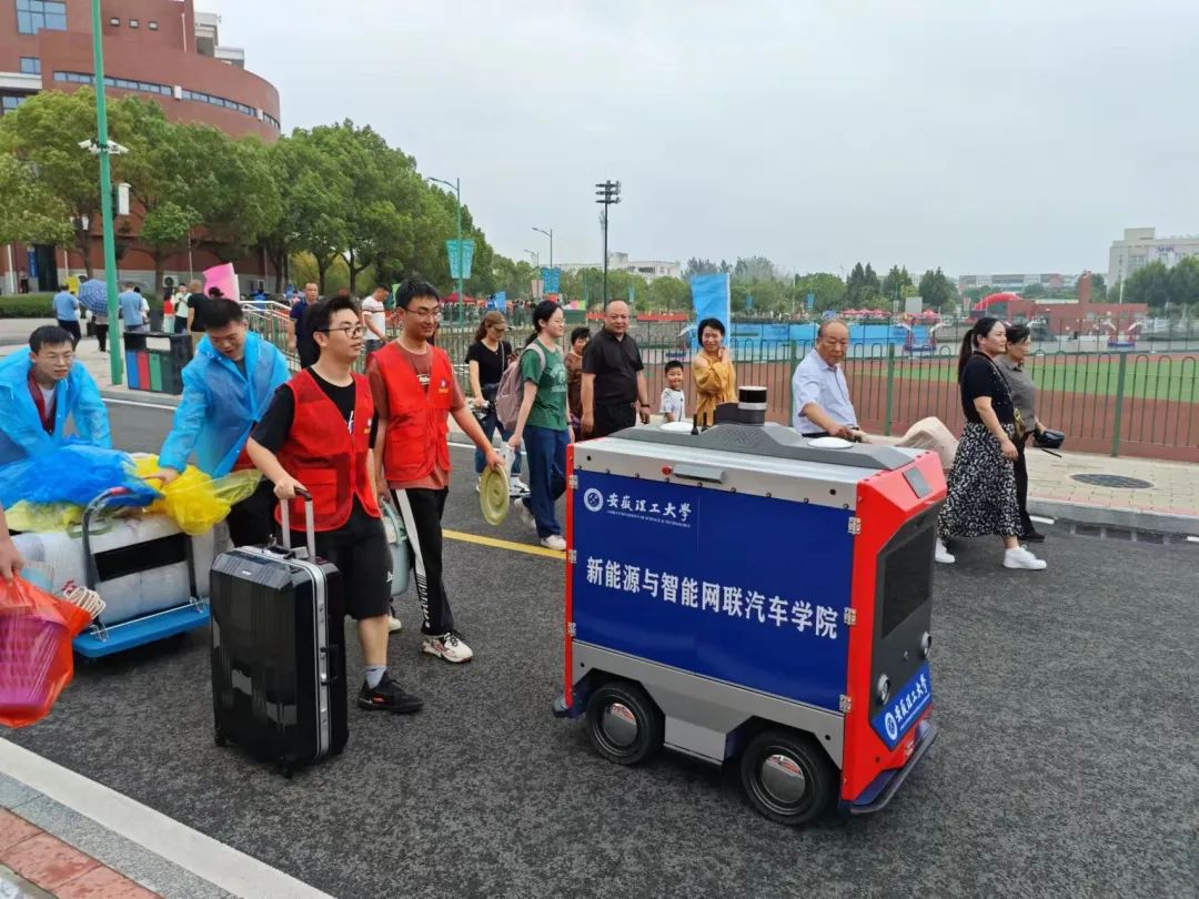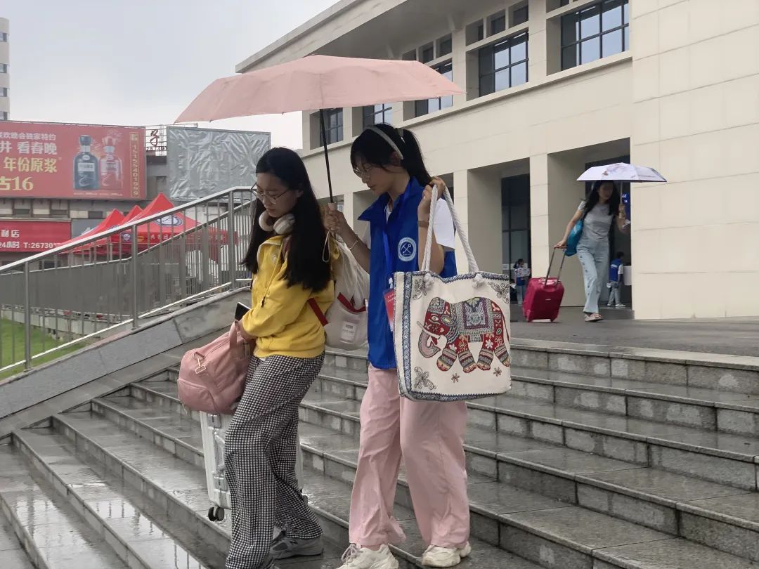 校内摆渡车接站点随着大巴车缓缓驶进,新生进入校园,“同学你好,我们来接你啦,欢迎成为新安理人”“叔叔阿姨好,可以在这边乘车,我们带您去报道点!”志愿者们身着蓝色志愿服,高举欢迎引导牌,以最灿烂的笑容,用最饱满的精神和最暖心的举动,帮助新生们报名注册、行李搬运,一路上为新生及家长答疑解惑,指引路线,每一步都安排得井井有条,确保每位新生都能快速适应新环境。冒着阵雨,志愿者们也是冲锋在前,给新生和家长搬运行李,撑起雨伞,让新生及其家长深切感受到来自安理志愿者的温暖与帮助。
