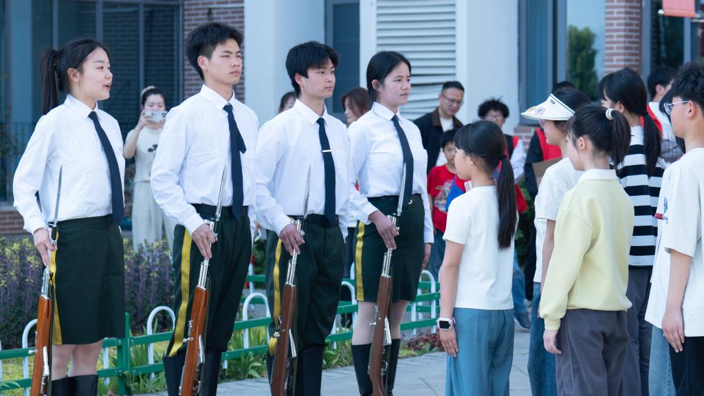 操场实训,动作规范。课程教学结束后,校国旗护卫队来到操场,对附属小学的升旗手进行升国旗动作要领的培训指导。国旗护卫队队员们亲自示范,从站姿、持旗姿势到正步走等动作,每一个细节都认真讲解并耐心纠正。指导的过程中,他们还向小升旗手们强调升旗的特殊含义,让孩子们明白升旗不仅是一种仪式,更是对国家的尊重和热爱的体现。